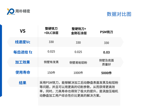 采用PSM銑刀,能夠解決加工后動靜盤表面發(fā)黑及粘鋁粉等問題,并且可以用更高的切削參數(shù),從而獲得更高效率,同時(shí),刀具壽命也得到了極大的提升,是渦旋壓縮機(jī)動靜盤加工用戶綜合性價(jià)比更高的解決方案。