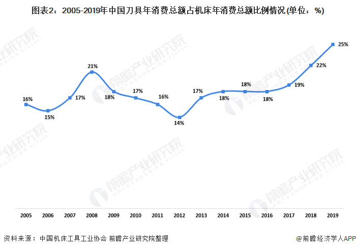 我國連續(xù)多年機(jī)床消費(fèi)量居全球第一,但是刀具消費(fèi)水平偏低。在德、美、日等發(fā)達(dá)國家,現(xiàn)代數(shù)控機(jī)床和數(shù)控刀具互相協(xié)調(diào)、平衡發(fā)展的規(guī)律十分明顯。據(jù)統(tǒng)計(jì),發(fā)達(dá)國家刀具消費(fèi)約為機(jī)床消費(fèi)額的50%左右。隨著國內(nèi)企業(yè)管理意識(shí)和技術(shù)實(shí)力的提升,越來越多的企業(yè)開始投入自動(dòng)化加工系統(tǒng),對數(shù)控刀具的消耗量逐漸增加。2012年以后,我國刀具年消費(fèi)總額與機(jī)床年消費(fèi)總額的比例呈現(xiàn)向上增長趨勢,2019年達(dá)到25%,說明我國工具消費(fèi)在提質(zhì)升級,但還遠(yuǎn)低于發(fā)達(dá)國家??梢娢覈毒呦M(fèi)水平仍然存在較大提升空間。