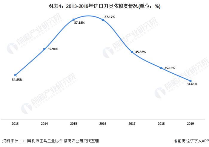 2019年我國刀具總消費(fèi)額達(dá)到393億元,其中國產(chǎn)刀具年消費(fèi)額約為257億元,進(jìn)口刀具約為136億元。雖然國產(chǎn)刀具在總量上以2/3的市場份額占據(jù)我國刀具消費(fèi)市場主導(dǎo)地位,但總體上以中低端產(chǎn)品為主。在136億元的進(jìn)口刀具中,絕大部分是現(xiàn)代制造業(yè)所急需的高效刀具。中興通訊事件給中國制造敲響警鐘,關(guān)鍵環(huán)節(jié)核心技術(shù)的缺失必將束縛中國高端制造業(yè)的蓬勃發(fā)展。作為高端裝備制造業(yè)配套用的數(shù)控刀具,加速其國產(chǎn)化對國民經(jīng)濟(jì)安全有著重要意義。根據(jù)我國機(jī)床工具工業(yè)協(xié)會(huì)統(tǒng)計(jì)數(shù)據(jù),2016—2019年進(jìn)口刀具占總消費(fèi)的比重從37.17%下降至34.61%,一定程度上說明我國數(shù)控刀具的自給能力在逐步增強(qiáng),進(jìn)口依賴度在逐年降低。